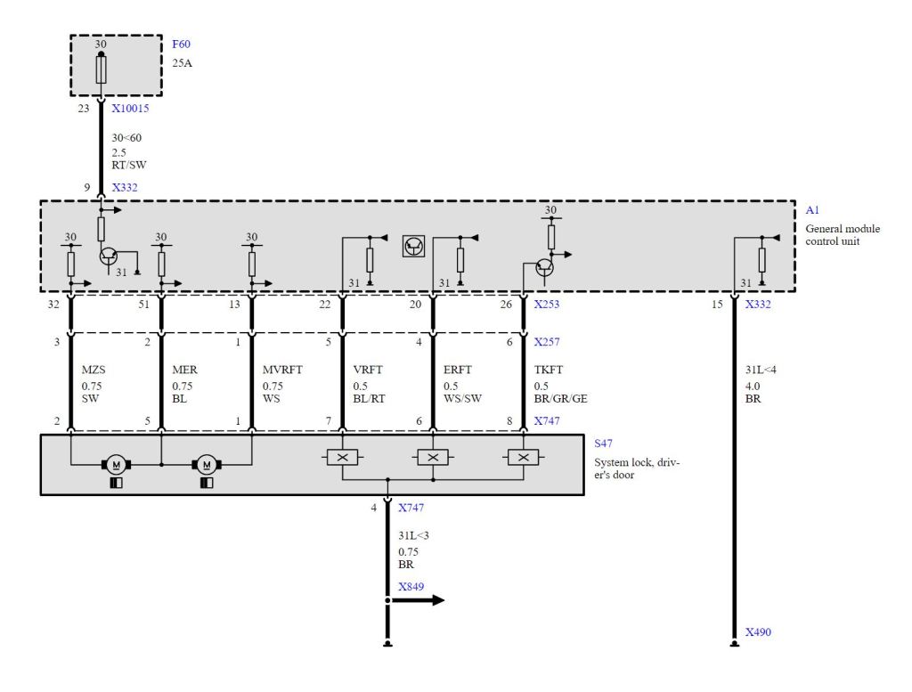 We can see a lot of good information in the above wiring diagram. The power supply is on the top of the diagram from fuse 60 with a RT/SW Red / Black wire which feeds power to pin 9 of the control unit General Module. The ground circuit is on the bottom of the diagram at X849 and X490 which is a BR or Brown wire. You can also see wire gauge size such as .75 on ground X849. You can also see some numbers at the power side such as (30) at the fuse. And 31L at the ground for X849. Let me explain what these numbers mean: